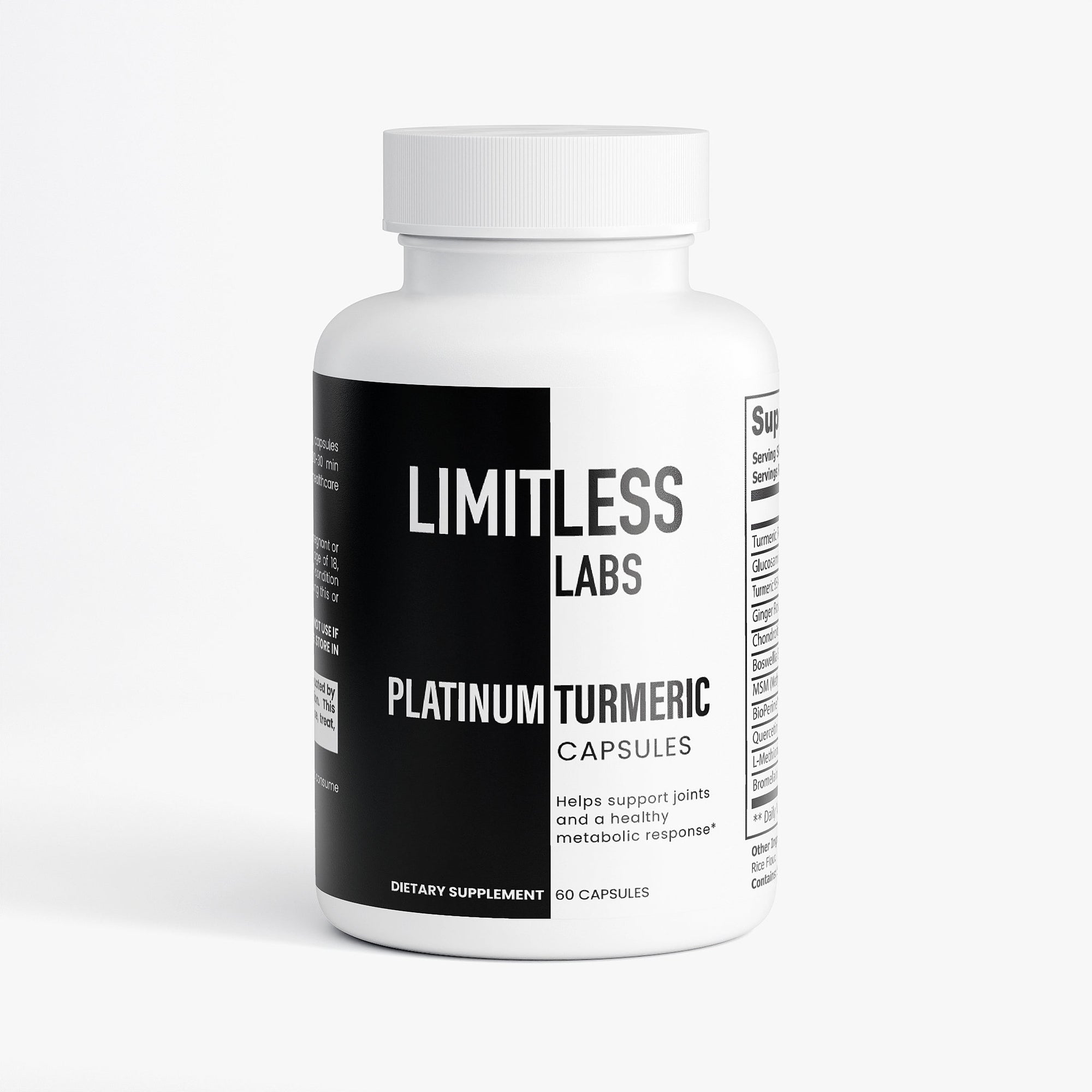 Ingredients: Turmeric Root Powder, Glucosamine Sulfate 2KCI, Turmeric 95% Curcuminoids, Ginger Root Extract, Chondroitin Sulfate, Boswellia Extract, MSM, BioPerine®, Quercetin Dihydrate, L-Methionine, Bromelain, Hypromellose (vegetable capsule), Rice Flour.